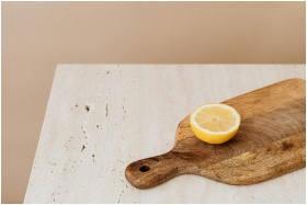 A fresh lemon half sits on a rustic wooden choppin