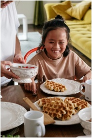 Smiling child enjoys waffles during a cheerful fam