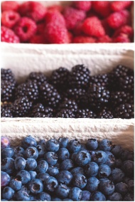 Close-up of fresh blueberries, blackberries, and raspberries at a market, showcasing vibrant colors and freshness.