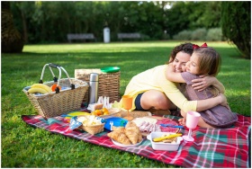 Heartwarming image of a mother and daughter hugging during a picnic in a tranquil park setting.