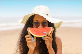 A woman with a sun hat enjoys watermelon on a sunn
