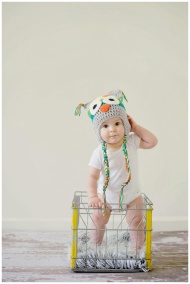 A cute baby wearing an owl hat standing in a basket, smiling and playful.