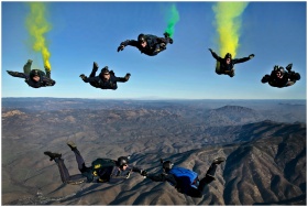 Dynamic aerial shot of skydivers performing stunts