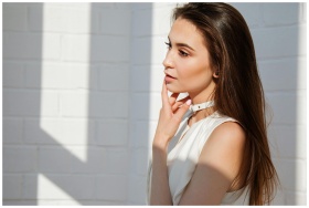 Natural light portrait of a stylish woman posing indoors with a pensive expression.
