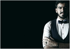 A stylish man wearing a bow tie and vest, posing confidently against a dark background.