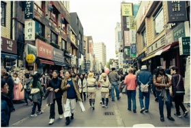 Vibrant city street in Korea with diverse people and shops. Captures urban life.