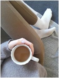 Person relaxing on a sofa with warm coffee, wearing cozy socks and leggings.