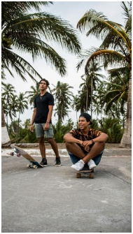 Two young men enjoying skateboarding in a tropical
