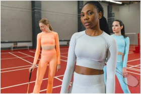 Three women in colorful activewear posing with rackets on an indoor tennis court.
