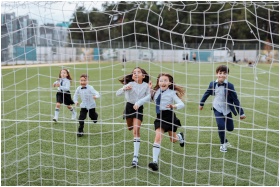 Group of children joyfully running towards the camera on a soccer field, showcasing a lively and playful moment.