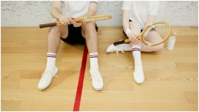 Two young adults sitting with vintage tennis rackets on a wooden floor, ready for a match.