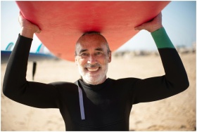 Smiling senior man holding a surfboard on a sunny beach in Portugal.