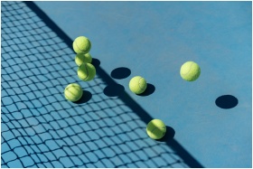 Tennis balls scattered on a blue court casting shadows, captured from above for a high-energy sports vibe.