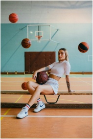 Stylish woman sitting on a bench in a sports hall with basketballs around.