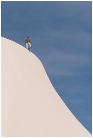 A skateboarder stands atop a white hill with a bright blue sky in Le Havre, France.