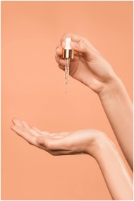 Close-up of hand applying serum with dropper on pe