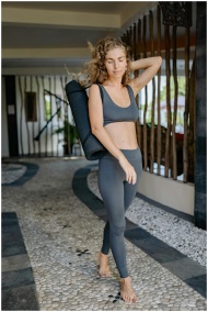 A relaxed woman walking indoors carrying a yoga ma