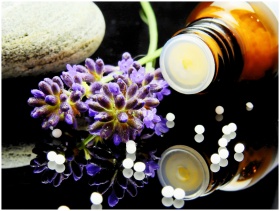 Lavender flowers with herbal homeopathy on a reflective surface, ideal for natural therapy themes.