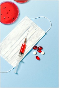Face mask, syringe, and pills on a blue background, symbolizing healthcare and medical research.
