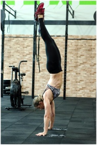 Woman athlete in a gym performing a perfect handstand during a workout session, showcasing balance and strength.