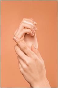 Close-up of hands with oil on peach background, emphasizing skincare and wellness.