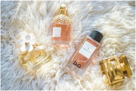 Elegant collection of perfume bottles on soft fur, highlighting luxury and style.