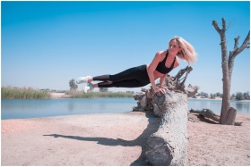 Woman performing an athletic pose on a log by a la