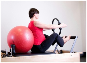 Pregnant woman in gym doing Pilates exercise with reformer and stability ball.