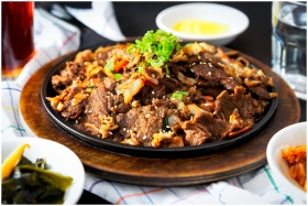 Delicious Korean BBQ beef dish with vegetables and sesame sprinkled on a hot plate.