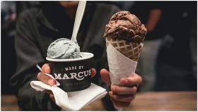 A close-up of chocolate cone and unique flavor ice cream cup held in hands.
