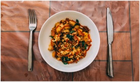 A vibrant vegetarian stir fry with colorful veggies served on a white plate with cutlery.