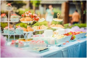A vibrant outdoor buffet table showcasing an array of colorful pastries and fruits, perfect for parties.