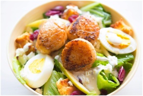 Delicious scallop salad with boiled eggs and fresh greens, perfect for a healthy meal.