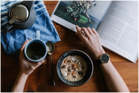 Top view of a healthy breakfast setting with muesli, tea, and magazine on wooden table.