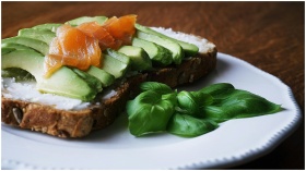 A delicious, healthy meal with avocado and smoked salmon on seeded bread, garnished with basil leaves.