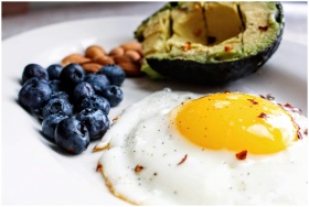 A nutritious breakfast featuring a fried egg, avocado, blueberries, and almonds.