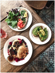 Delicious brunch with avocado toast, pancakes, and