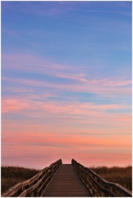 Captivating sunset over a coastal boardwalk leading into the horizon in Lagos, Portugal.