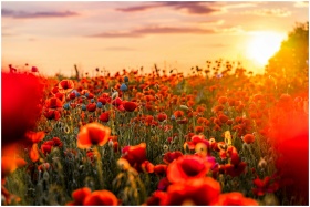 A lush poppy field glowing in the warm light of a