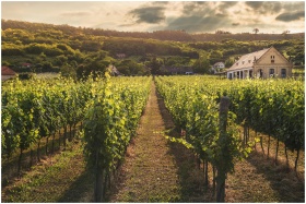 Serene vineyard scene with verdant rows under a dramatic sunset sky.