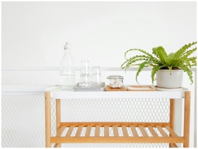 A stylish and modern beverage stand featuring a plant and water bottle in a clean indoor setting.