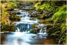 Peaceful waterfall flowing over mossy rocks in a lush forest setting.