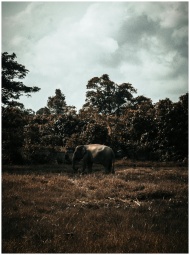 A lone elephant grazes peacefully in a lush grassland under a cloudy sky.
