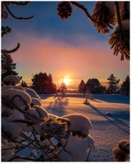 Beautiful winter sunset with snow-covered trees and a serene horizon.