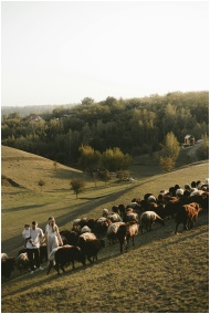 Shepherds guide their flock across a scenic hillside during a sunny day.