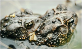 A detailed close-up view of two American toads (Anaxyrus americanus) in a watery habitat.