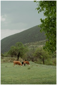 Cows grazing peacefully in a lush, picturesque mou
