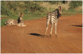 Two zebras in a safari setting, one resting and the other standing on a dirt road.