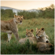 A group of lionesses resting in the savannah as the sun rises in Maasai Mara, Kenya.
