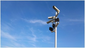 Multiple security cameras on a pole with a clear b
